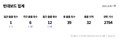 빈대보드에서는 일간 출몰 횟수와 주간 출몰 횟수 그리고 출몰 지역과 관련기사를 총집합해 현황판으로 알려드리고 있습니다.