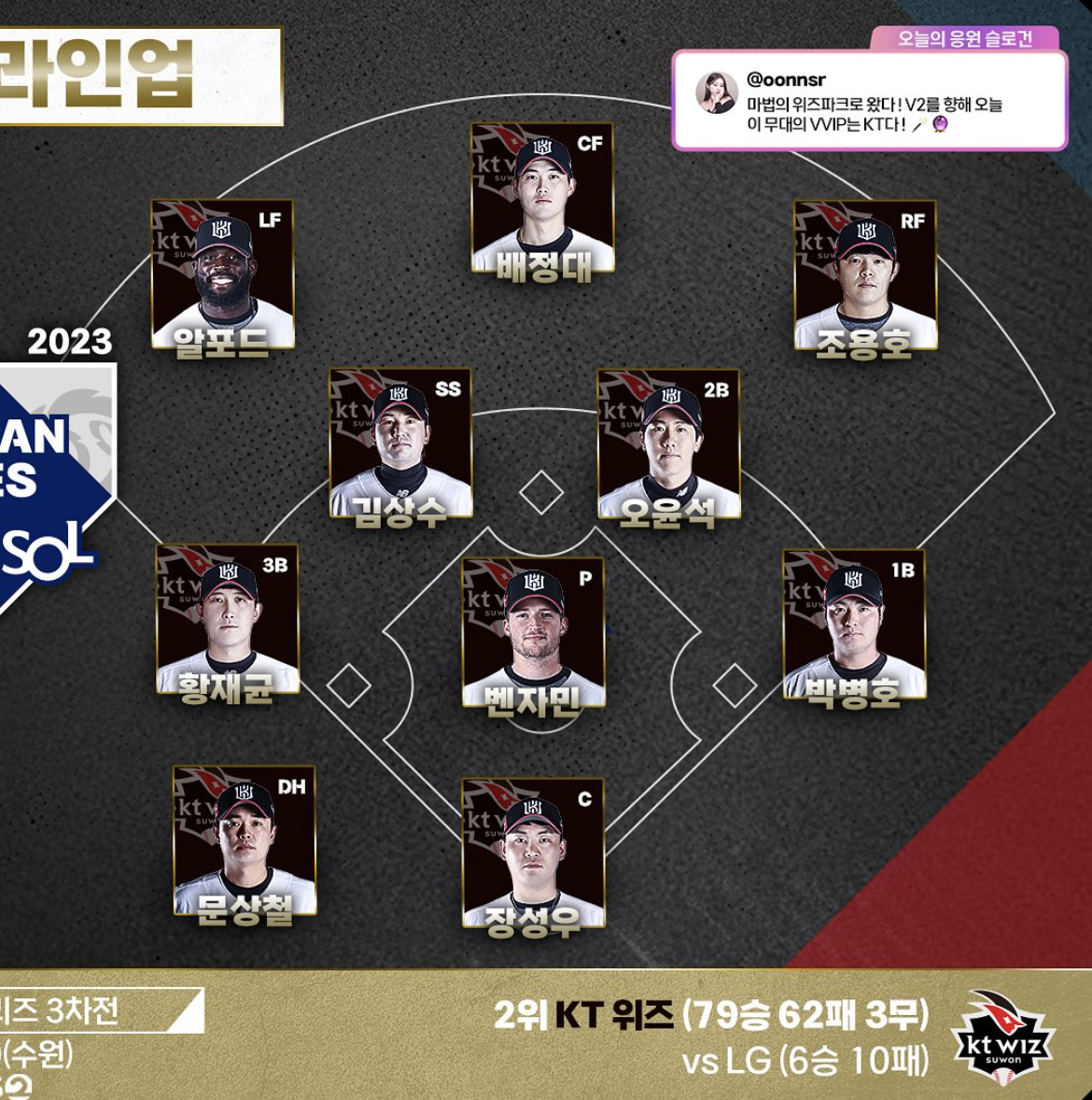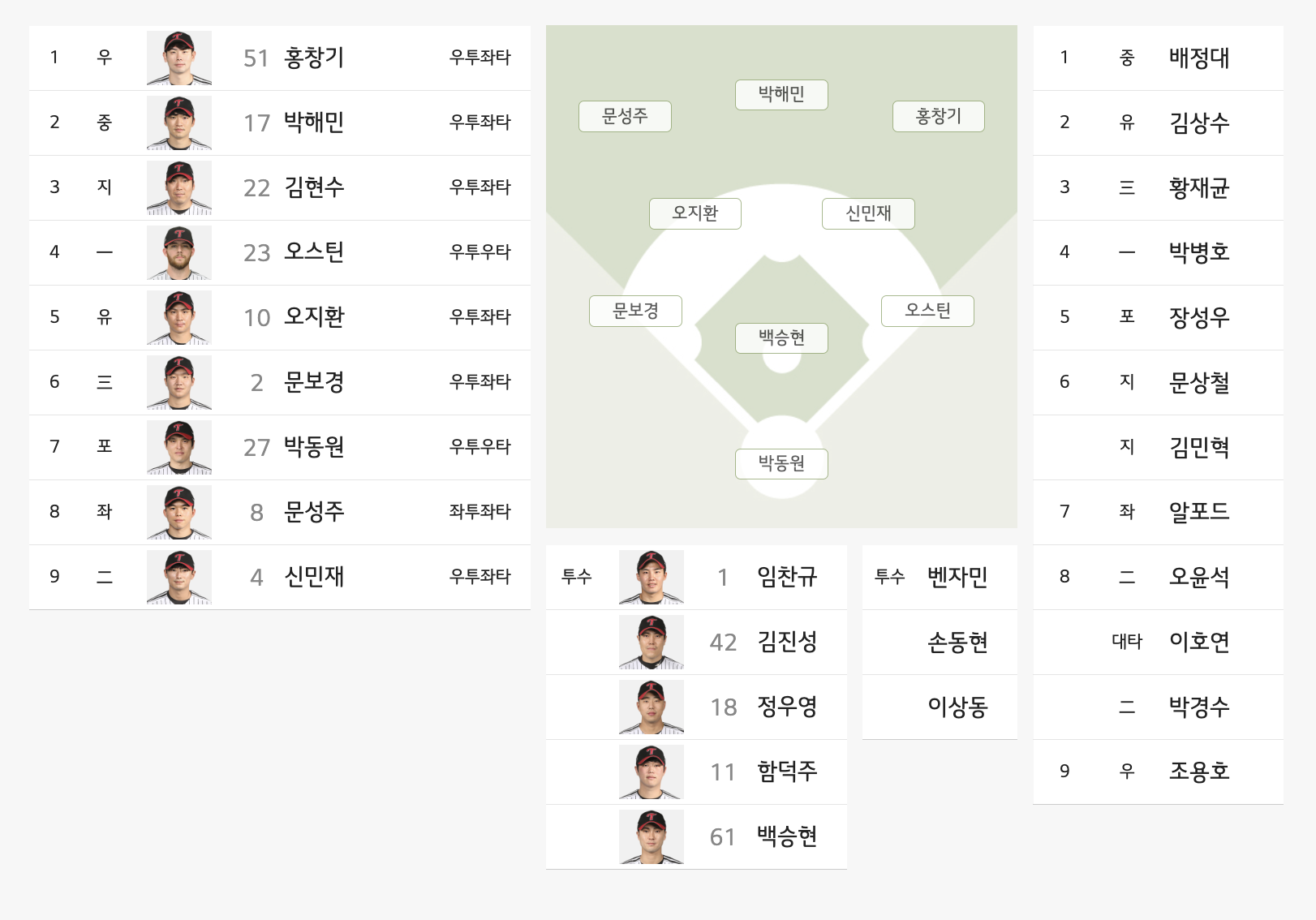 오늘의 양 팀의 선발을 말씀드리겠습니다. 먼저 LG 선발은 임찬규 선수가 선발 투수로 마운드에 등장했습니다. 임찬규의 뒤를 이어 김진성, 정우영, 함덕주, 백승현, 유영찬, 고우석, 이정용 투수가 마운드에 올랐습니다. KT선발은 웨스 벤자민 투수입니다. 뒤를 이어 손동현, 이상동, 황재균 선수가 마운드에 올랐습니다.