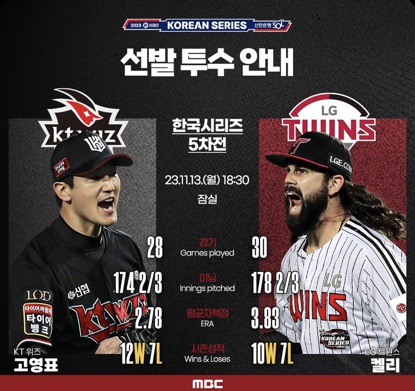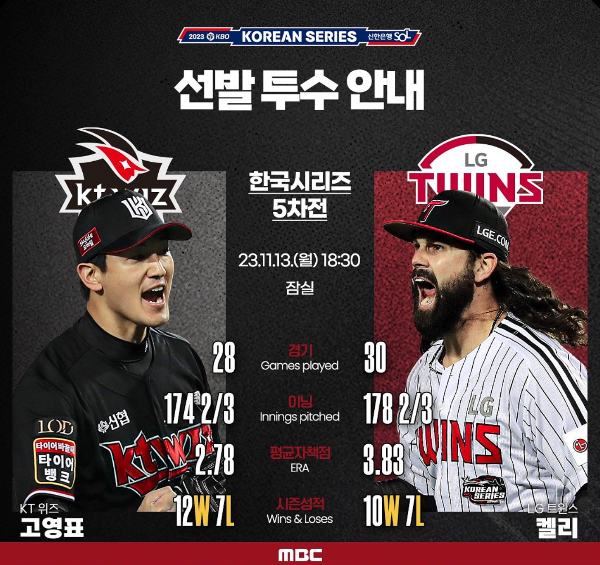 한국시리즈 5차전 선발 투수는 KT 위즈 고영표선수, LG트윈스 켈리 선수입니다. KT위즈는 이어 이상동, 손동현, 박영현 선수가 마운드에 등판했습니다. LG트윈스는 켈리선수에 이어 유영찬, 함덕주, 고우석 선수가 마운드에 올랐습니다. 마지막 아웃카운트 영상에서 보시면 아시겠지만 고우석 선수가 전 경기 저조한 플레이로 마음고생이 있었는지 마무리투수로 최종 우승을 하고도 여러 감정이 보이는 표정이었습니다. KT위즈 및 LG트윈스 투수분들 모두 고생하셨습니다.