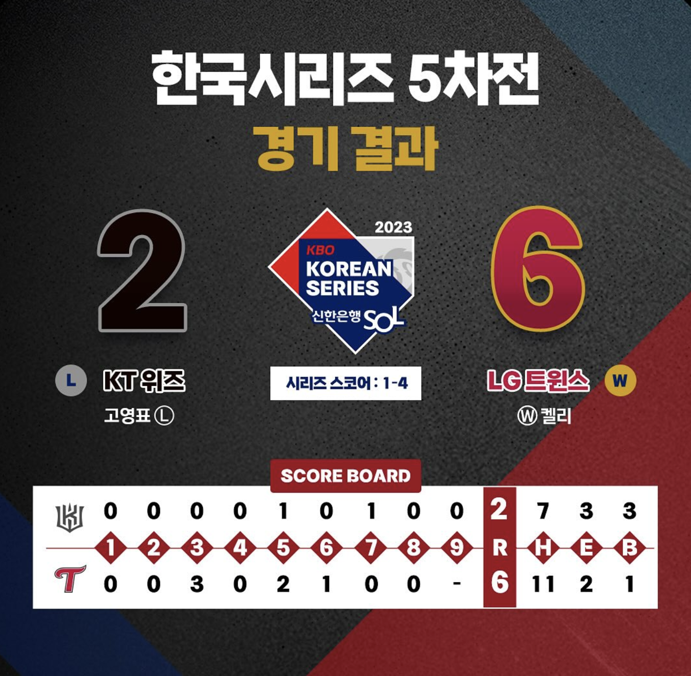 한국시리즈는 총 7차전 중 5차전으로 마무리하게 되었습니다. 1차전의 KT위즈의 마지막 승리 이후 2,3,4,5차전 모두 LG트윈스가 승리를 가져가게 되면서 2023 한국시리즈 최종 우승팀은 LG트윈스가 되었습니다.