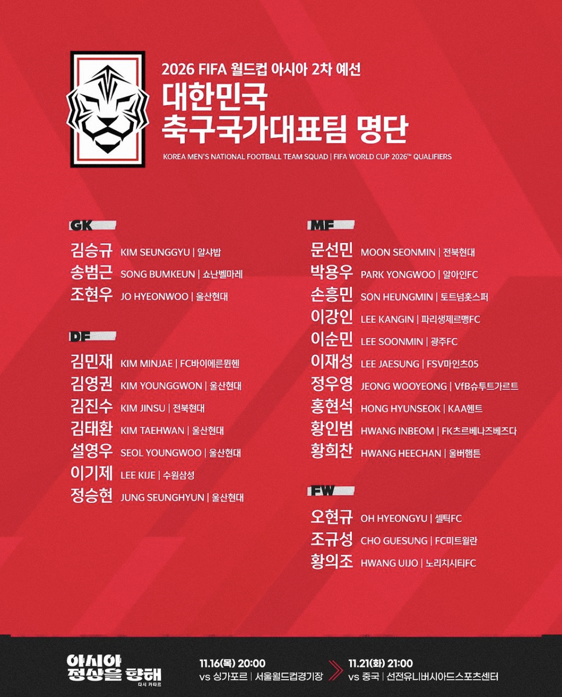 - 싱가포르전 축구 국가대표 명단
